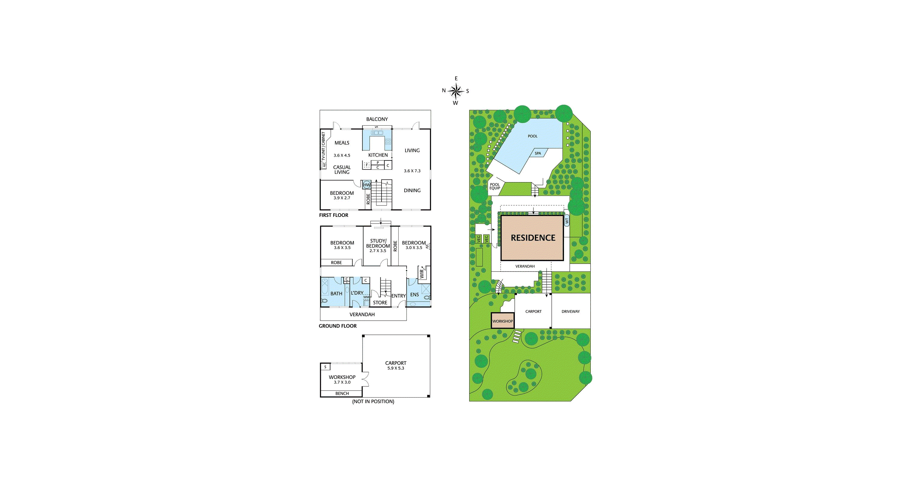 The first floor features an original timber kitchen with cork floors, a sitting room with original joinery and a curated selection of homewares, a study (that could also be used as a bedroom, a living room and a dining room. The dining room features an incredible rice paper pendant, with built-in spotted gum cabinetry featuring a brass benchtop. As the house has an east/west aspect, it receives the most incredible morning and afternoon light that adds to its overall ambience. The ground floor includes a main bedroom with built-in spotted gum robes, a small but tidy ensuite, a sitting room, an open timber staircase, an original main bathroom with timber benchtop and vanity, and a guest bedroom with a double bed. The property also includes a large pool and spa in the backyard, surrounded by a natural rock wall with native planting.
