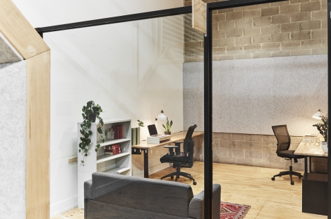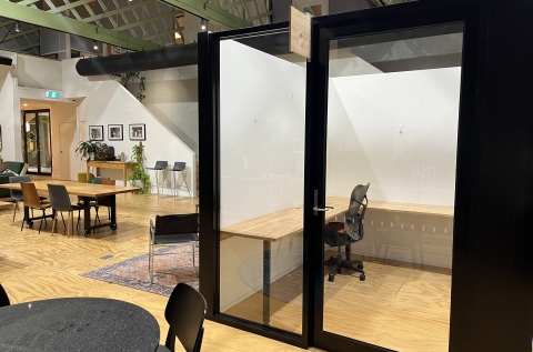 A dozen art studios on the top floor of iconic building. White painted MDF walls. Lockable doors. Concrete floor. Some daylight but mostly overhead fluorescent lighting. Paint sink nearby and kitchenette.