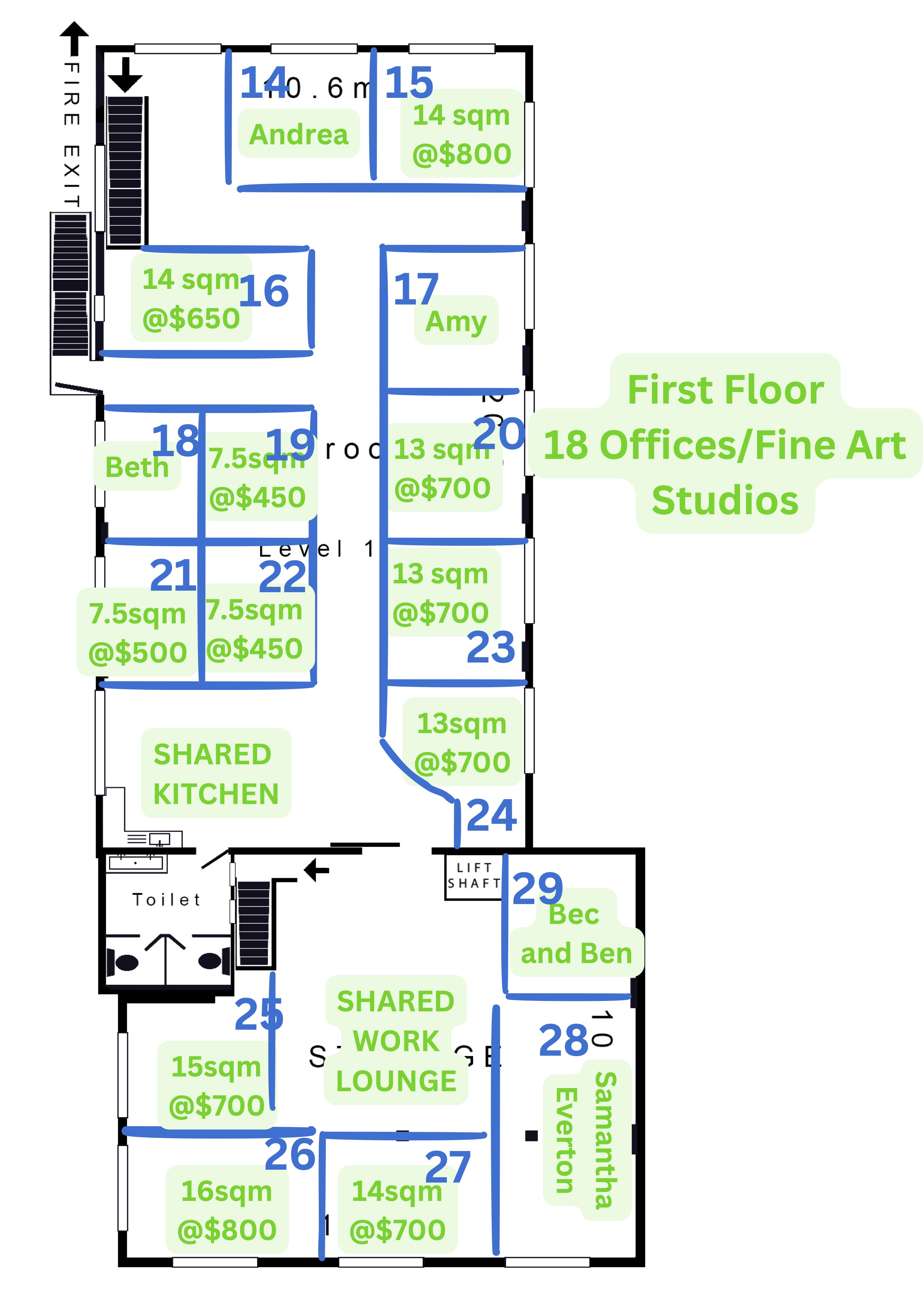 Large Light filled Factory, wooden floor upstairs, concrete downstairs. Different zones for different activities. Timber and corrugated plastic partitions with era appropriate refurbished doors. Large outdoor garden with workshop/camp kitchen.