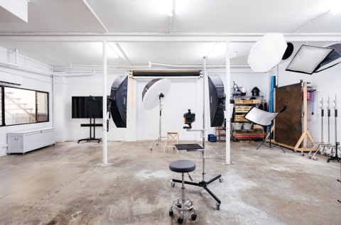 The studio is filled with plenty of light, and has a strong industrial style with high ceilings, perfect to get lights overhead of your subject.
