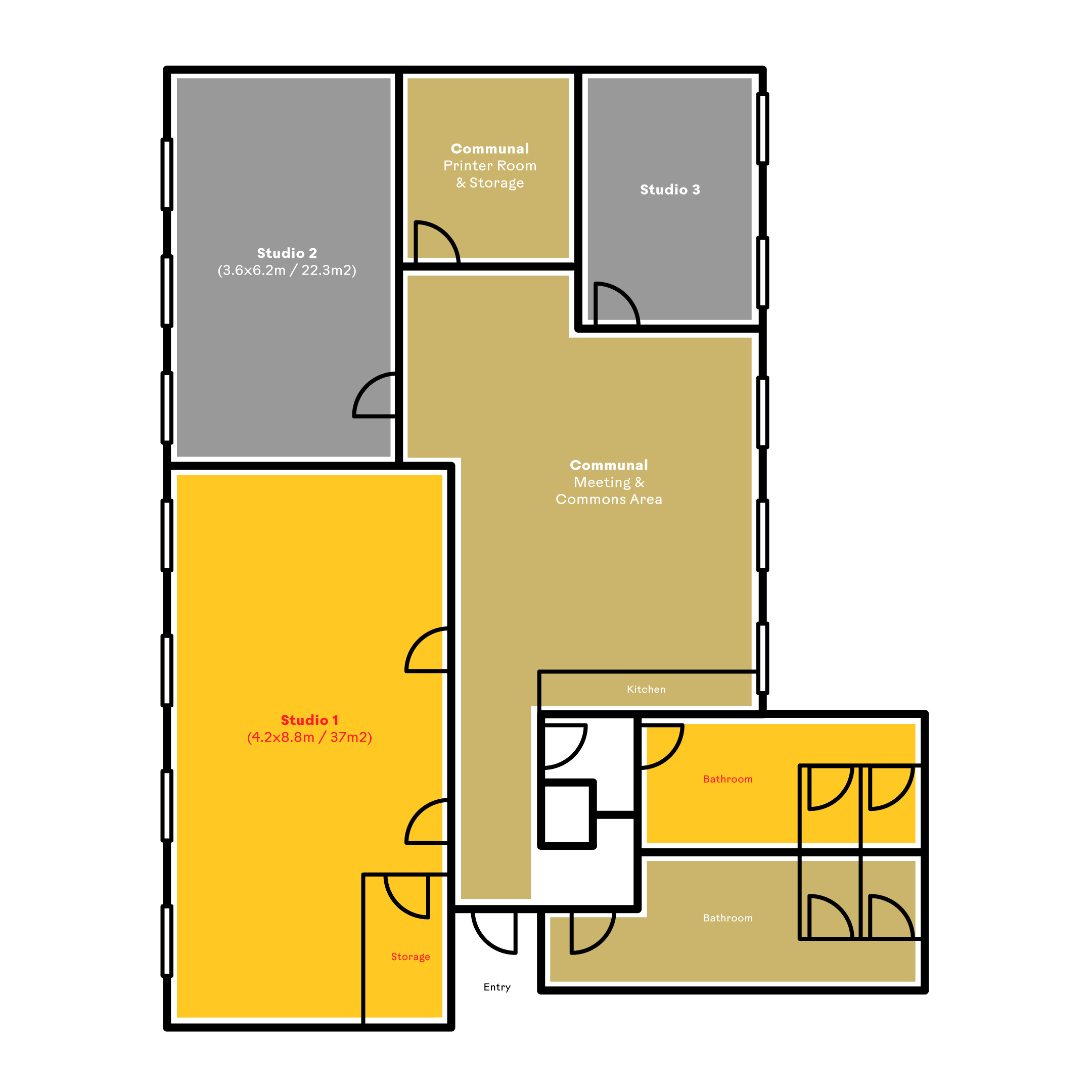 Studio 1 (4.2x8.8m / 37m2) at Footscray Office Of Design is a large, beautifully-lit space, with freshly painted white walls, vintage posters, happy plants & good vibes. It is furnished as per photos and comes with a (powerful) split system.
