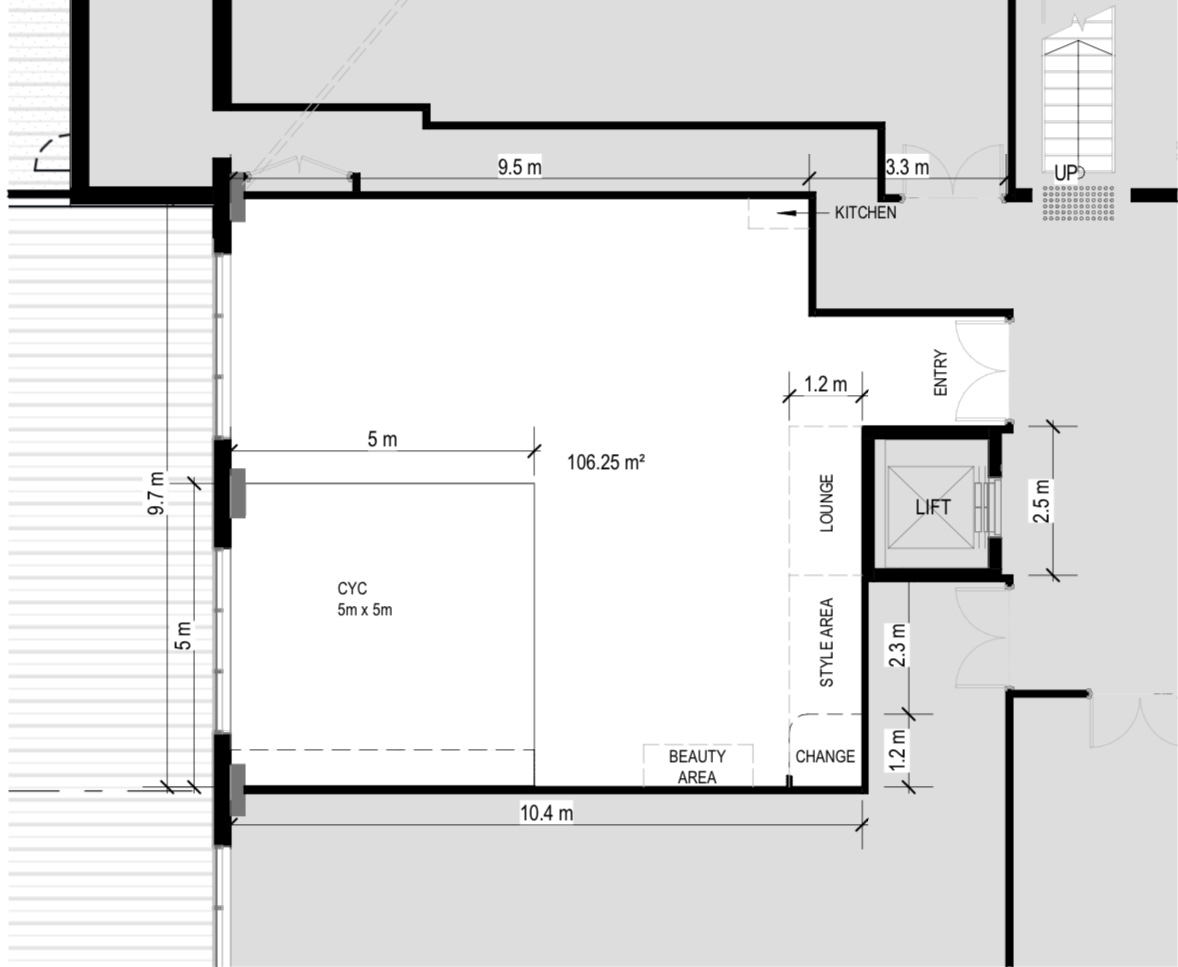 Kanvas Studios features a 5m x 5m Cyclorama wall, providing a seamless backdrop for your creative needs. With high vaulted ceilings ranging from 4m to 6m, create a spacious environment that allows for freedom of movement and experimentation.