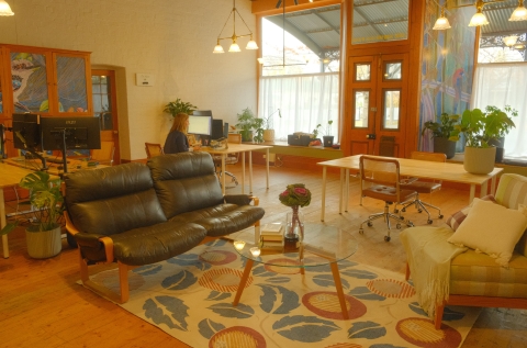 Present Company Studio is warm, inviting, and purposefully designed to nurture creativity. Natural light filters through large front windows, casting a gentle glow across the wooden floors and vintage architectural features. The space combines a casual lounge area with well-spaced desks ideal for focused creative work. The palette leans warm and earthy, with timber tones, soft textiles, and natural greenery.