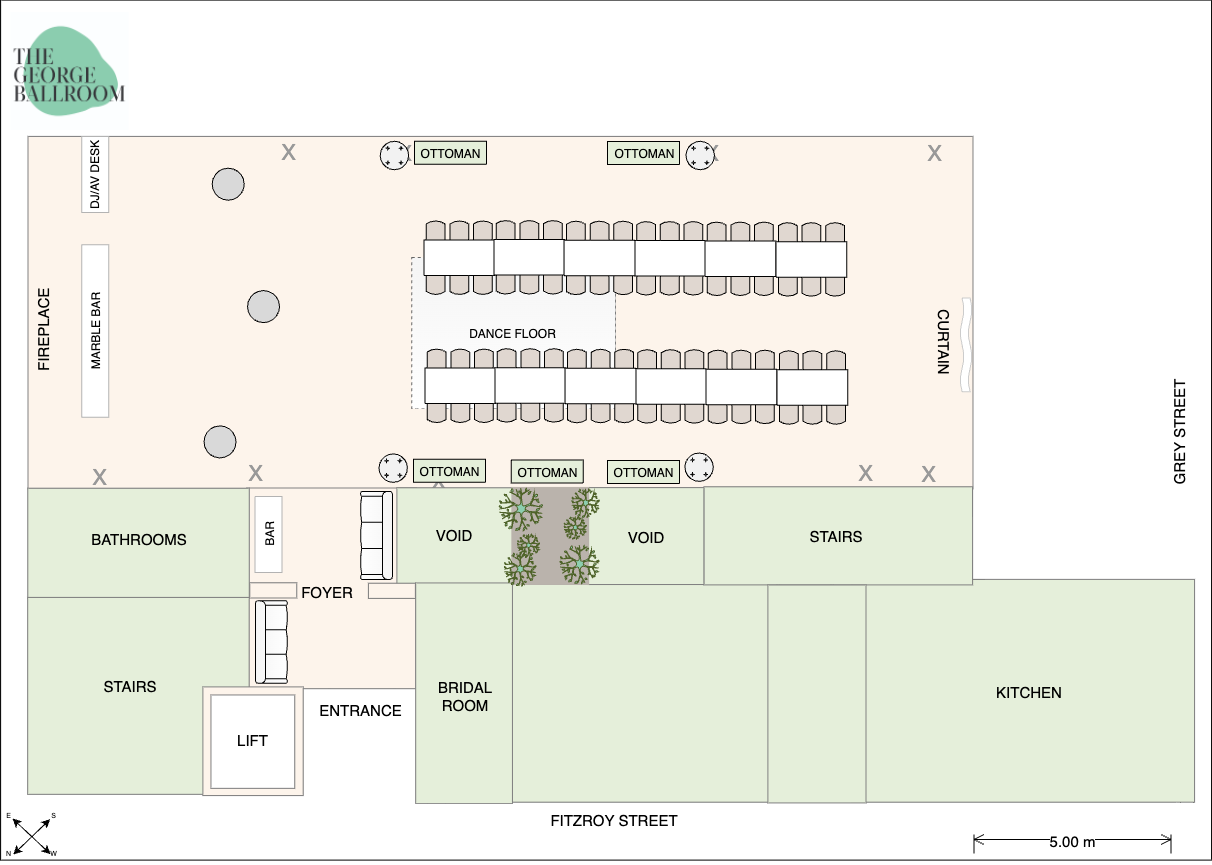 Situated in the heart of St Kilda, The George Ballroom seamlessly combines historical charm with modern elegance. Built in 1886, this iconic venue features high ceilings, ornate windows, and original Victorian pillars, bathed in natural light. The space boasts a striking ornate mirror above the fireplace, and a soft palette of blue, ivory, and green. Its timeless design, enhanced by Art Deco elements, distressed walls, and chic furnishings, provides the perfect setting for weddings, corporate events, and film or photography. The main ballroom accommodates up to 220 guests for standing events or 150 for seated occasions. With an open floor plan, the space is ideal for both intimate gatherings and grand celebrations.