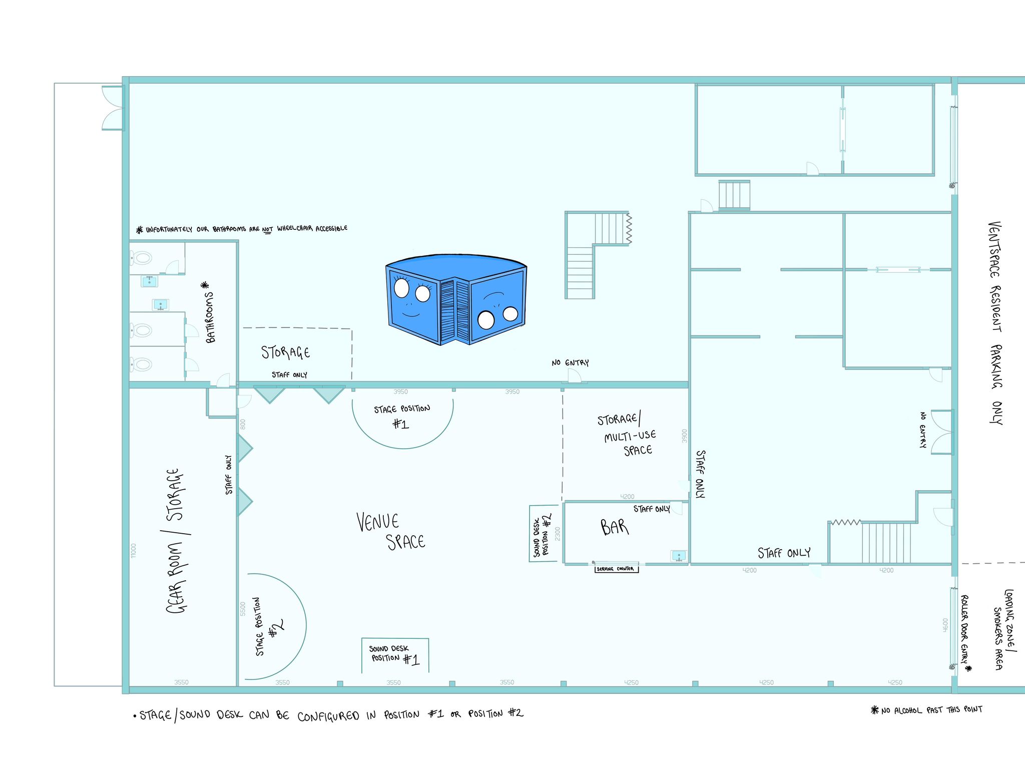 8x Parking spaces are provided to resident artists (first come first serve on any given day), shooting studio clients have access to 2x parking spaces during bookings. No parking provided to event goers but event organisers can use 2x parks to bump in / out.